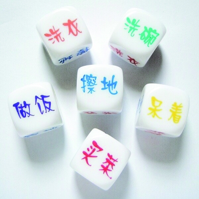 昨日,記者在沙坪壩女人街一家飾品店找到了這種骰子,骰子是用塑料制成的,和普通骰子的大小無異,“這種骰子銷路很好,一般都是女孩子買”,店主李于婷說,這種5元錢一個(gè)的骰子深得80后女子喜歡,她笑著告訴記者,曾有一名女孩非常興奮地買下一個(gè),握到骰子的那一刻便說,將如何運(yùn)用這個(gè)骰子,讓家務(wù)活全部轉(zhuǎn)到老公手中去。