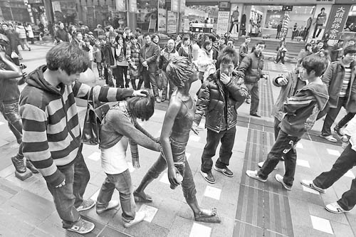 北京女孩清越去年6月28日參加了一次“定格”:大家隨意在路上走,一個(gè)信號發(fā)出來,參加活動(dòng)的人就保持不動(dòng),持續(xù)3~5分鐘!拔覀兿牒椭車男腥诵纬蓜(dòng)靜的對比,純粹就是好玩!眳⑴c者全從網(wǎng)上召集,活動(dòng)那天來了將近200人。