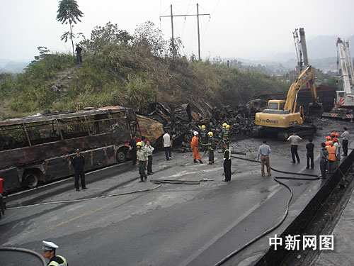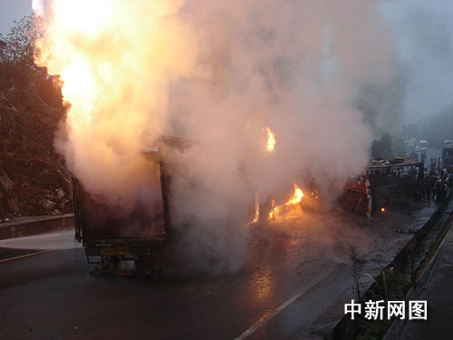 由于集裝箱上滿載約十八噸的膠水和家俱,碰撞后很快起火,大客車與運礦大貨車亦不能幸免。南丹消防官兵接警趕至?xí)r,發(fā)現(xiàn)現(xiàn)場火光沖天成了火海,其中集裝箱大卡車正猛烈燃燒,而大客車和運礦大貨車不久后也被燒成廢鐵。消防官兵隨后出動水槍滅火,四輛消防水車頻繁往返縣城運水達(dá)二十多車次。救援工作至十八日下午六時許才結(jié)束。