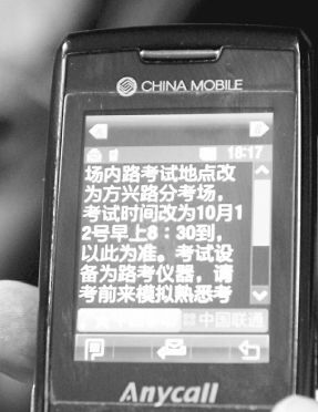 “場(chǎng)地考試點(diǎn)改為方興路分考場(chǎng),請(qǐng)于10月1日至8日早上8:30到考場(chǎng)進(jìn)行場(chǎng)內(nèi)路模擬,合格后方可參加考試!眹(guó)慶節(jié)前夕,很多參加駕駛證直考的考生收到了這樣一條短信,短信后附有考試地址和聯(lián)系電話。