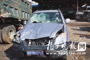 昨天上午在停車場,記者見到了肇事車輛:牌照為蘇HBU790雙環(huán)越野車,前擋風(fēng)玻璃半邊差不多被撞碎,上面還有一個大洞,直徑為49厘米,并且從碎裂的玻璃縫隙中提取了數(shù)根頭發(fā)。從車內(nèi)名片盒內(nèi),記者找到一張杜軍本人的名片,上面寫有“志圣科技(廣州)有限公司蘇中地區(qū)經(jīng)銷部工程師”字樣。據(jù)楚州區(qū)公安局交警大隊辦公室主任朱士能介紹,昨天上午杜軍血檢結(jié)果顯示,他屬于醉酒駕車,應(yīng)負事故全責(zé)。警方同時已安排人員到杜軍家讓他們盡快先拿出10萬元來做死者家人的安撫工作。一名不愿透露姓名的民警告訴記者,從事故發(fā)生時間以及杜軍的血檢結(jié)果來看,杜軍應(yīng)該是中午喝的酒。他同時告訴記者,該車在事故發(fā)生前還有一起闖紅燈,兩起違停行為。