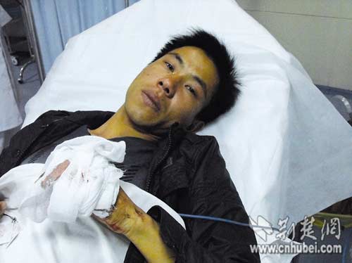 醫(yī)生經(jīng)過了兩個(gè)多小時(shí)的手術(shù),但覃櫞左手的小指還是沒接上。前日下午,25歲的洪湖小伙子覃櫞在武漢白沙洲海鮮大市場(chǎng)里剁掉小指,他說自己這樣做是為了證明清白。