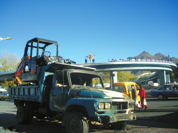 記者在事故現(xiàn)場看到,一輛被燒成空架的東風(fēng)車及被燒過的裝載機放置在路邊,立交橋的欄桿已被撞出一個寬大的口子,橋下3柱景觀路燈也被燒壞。橋下地面還殘留著大片油漬,旁邊被大火殃及的工商部門辦公樓燒毀嚴重。清理現(xiàn)場的工作人員正在對一些危險建筑物進行拆除,并對現(xiàn)場油污進行清理。