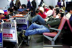 受降雪影響,昨日,首都國際機(jī)場部分航班延誤或取消,大批乘客滯留。
