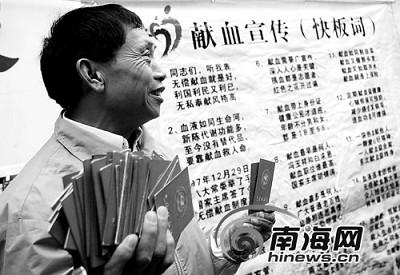 “我健康我獻(xiàn)血,你捐血你快樂(lè),救人生命積功德……”在?诿髦閺V場(chǎng),省血液中心采血車旁,穿著樸素的楊順德,操著四川口音、拿著半導(dǎo)體喇叭重復(fù)地向人們宣傳獻(xiàn)血的好處和獻(xiàn)血知識(shí)。