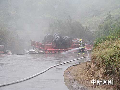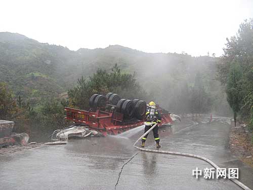 中新網(wǎng)溫州11月20日電(記者 江耘 通訊員 徐行號(hào))11月20日早晨6時(shí)許,浙江樂清市樂成鎮(zhèn)往白石鎮(zhèn)方向的盤山公路轉(zhuǎn)彎處一輛載有15噸的鹽酸的半掛車發(fā)生側(cè)翻泄漏事故。