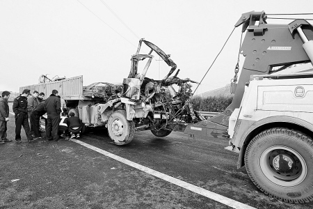 昨天下午,記者趕到西禹高速時,省公安廳交警總隊高交支隊的民警正在指揮清障車拖拉車號為陜E2679的一輛半掛貨車。這輛滿拉著鋼材的半掛貨車,駕駛室受撞擠壓成扁平狀,已被燒成黑色。如果不是右側(cè)車身伸出扭曲的車門,幾乎無法讓人判斷出這里就是車頭。省交警總隊高交支隊一大隊事故科科長楊大偉介紹,這輛車的司機(jī)和副駕駛座上的人均已當(dāng)場死亡。
