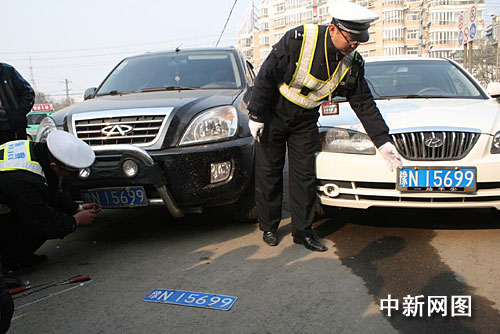據(jù)交警二大隊(duì)嚴(yán)管街中隊(duì)長(zhǎng)梁輝介紹,象這種套牌的嚴(yán)重交通違法行為,應(yīng)將車(chē)輛暫扣,收繳非法號(hào)牌,并處于2000元以下罰款。完