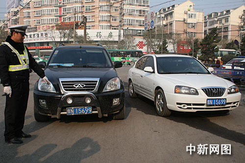 當(dāng)日上午9時(shí)10分,正在文化路崗執(zhí)勤的交警二大隊(duì)民警李磊看到一中年人急匆匆向他跑來(lái),“民警同志,快攔住這輛等紅燈的奇瑞車(chē),它掛的牌照和我的一樣,是一輛套牌車(chē)。”民警朝當(dāng)事人的手指的方向望去,果然見(jiàn)一前一后停著兩輛轎車(chē),前車(chē)是一輛黑色奇瑞,后面是一輛白色現(xiàn)代,而兩車(chē)的號(hào)牌都是予N15699。