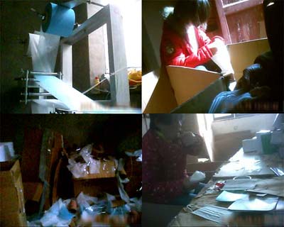 記者看到這里正在進行包裝,在這個所謂的廠家里生產(chǎn)衛(wèi)生用品的工人們,沒有一個人穿著工作服,戴工作帽,包裝封口的機器,也是幾根木條定在一起,就湊合著用了,最出乎記者意料的,還不是這些簡陋的生產(chǎn)環(huán)境,而是包裝口罩的工人極不規(guī)范的動作,看到這個阿姨一邊蘸著唾沫一邊包裝口罩的手法,讓記者不禁為那些可能會戴上這包口罩的人感到擔心。