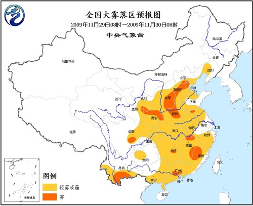 預計29日早晨到上午,西北地區(qū)東部、華北中南部、遼寧中部、黃淮中西部、江淮大部、江漢、江南大部、華南大部以及四川盆地大部、重慶大部、貴州西北部、云南南部等地有輕霧,其中,北京南部、天津、河北中部和西南部、山西中南部、河南中部、陜西中部、四川盆地南部、湖南中部、江西北部和東部、福建西部、廣東中部、云南南部等地的部分地區(qū)有能見度小于1000米的霧,局地能見度不足200米。