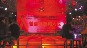 昨天晚上,天下著細雨,渝中區(qū)上清寺附近的酒吧里,同性戀者舉行世界艾滋病日文藝晚會,我市百余名男男同性戀聚集在此。記者以彩虹工作組防艾志愿者身份,走近男男同性戀者,所見所聞,發(fā)人深省。