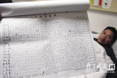 劉師傅出示的工地考勤表上,記滿了工人加班記錄。(李海勇 任國勇 文/攝)