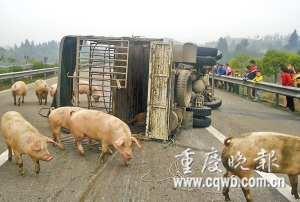昨日,豬販汪祥全受到處罰。來自市高速公路支隊(duì)的消息稱,近幾年,高速公路上不時(shí)出現(xiàn)運(yùn)輸生豬貨車翻車后豬群亂串的狀況,其中曾有100多頭豬在成渝高速路亂串,先后引發(fā)4起車禍、3人受傷,道路封閉4小時(shí)。