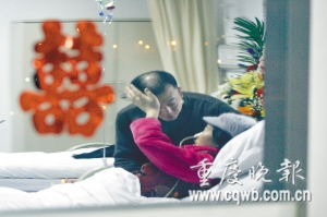 由于病痛折磨,蔣翠有些支撐不住,但她依然堅(jiān)持坐著。張兵將蔣翠強(qiáng)行抱回病床,讓她躺著休息!皼]想到,這場(chǎng)婚禮晚了13年!笔Y翠說,自己1996年和丈夫結(jié)婚時(shí),由于經(jīng)濟(jì)拮據(jù),并沒有舉行婚禮。不過,13年后,在她被病魔糾纏時(shí),丈夫卻以這種形式完成了她的夢(mèng)。