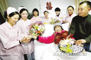 女子叫蔣翠,今年38歲。男人叫張兵,今年44歲。張兵推著妻子,輪椅軋過紅地毯,迎著空中的花瓣,進(jìn)入病房。“祝福你們,你們讓我們懂得了攜手到老的承諾。”醫(yī)生護(hù)士共同祝賀夫妻倆,希望他們“新婚”快樂?粗贾贸尚路康牟》,蔣翠哭出了聲音。“希望你們能堅(jiān)持下去,恩愛永遠(yuǎn)!蔽渚傟(duì)醫(yī)院醫(yī)務(wù)處主任向貴平擔(dān)當(dāng)起了主婚人的職務(wù),向夫妻頒發(fā)了結(jié)婚證。這張結(jié)婚證也傾注了醫(yī)院醫(yī)生護(hù)士的心血。通過和南岸區(qū)民政局聯(lián)系、溝通,婚姻登記處工作人員特地到病房,為蔣翠辦理了結(jié)婚證。