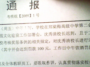 昨天上午,記者根據(jù)網(wǎng)友提供的地址打開該網(wǎng)頁時(shí),發(fā)現(xiàn)了一篇題為《最猛校長(zhǎng)》的帖子,一則蓋有“鄭梁梅學(xué)!惫碌耐▓(bào)內(nèi)容稱:12月11日下午1時(shí),學(xué)校在鄭梁梅第二會(huì)議室組織召開各學(xué)部校園文化建設(shè)工作部署會(huì),因校長(zhǎng)沈秀清遲到,且在工作日中午喝酒,所以根據(jù)學(xué)校獎(jiǎng)懲條例相關(guān)規(guī)定,對(duì)沈秀清校長(zhǎng)通報(bào)批評(píng)并罰款600元。在帖子里,記者發(fā)現(xiàn)600元罰款分兩種:開會(huì)遲到罰款100元,工作日中午飲酒罰款500元。