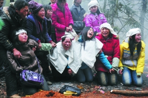正午十二點(diǎn),六七家失去親人的家庭都放起了鞭炮,敲起了鑼鼓。