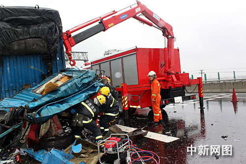 今天早上8時許,高速寧波支隊(duì)指揮中心接到報(bào)警稱在繞城高速姜山北互通附近有兩車追尾,有人受傷,且傷勢較重。接警后,四大隊(duì)巡邏民警立即趕赴現(xiàn)場。到達(dá)事故現(xiàn)場后,民警發(fā)現(xiàn)肇事的是蘇FU3033車牌號重型廂式貨車和閩A15387號重型廂式貨車。其中后車閩A15387號大貨車駕駛室已經(jīng)嚴(yán)重變形,駕駛室在碰撞后,被擠壓成厚度不足1米的“鐵餅”。透過碰撞的殘骸可以隱約看到有兩人被困車內(nèi),氣息十分微弱,F(xiàn)場民警在展開施救同時,立即要求增援。8時26分,鄞州消防大隊(duì)接到指令后立即出動1輛搶險(xiǎn)救援車、7名消防官兵趕赴現(xiàn)場。