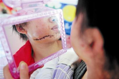 小瓊今年18歲,在馬巷車站附近一家臺球館當(dāng)收銀員,前日下午記者在她家里看到了她,只見左臉下面有一道幾厘米長的傷口,被密密麻麻地縫了起來,足足有幾十針(圖)。