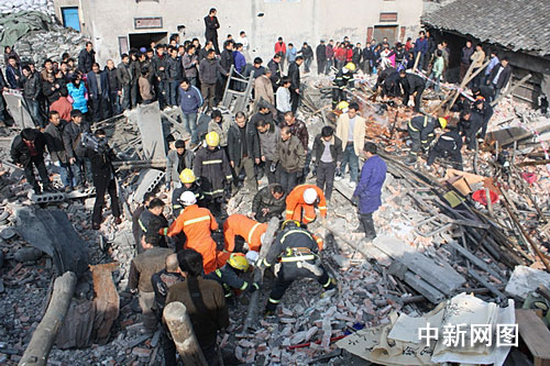 當(dāng)日下午13時(shí)14分,瑞安市消防大隊(duì)接到報(bào)警后,迅速調(diào)集公安現(xiàn)役消防隊(duì)及專職消防隊(duì)6輛消防車30名指戰(zhàn)員趕到現(xiàn)場實(shí)施救援。消防官兵到達(dá)現(xiàn)場時(shí),現(xiàn)場一片狼藉,百余平方米的房屋已成為廢墟,現(xiàn)場嘈雜聲混成一片,爆炸現(xiàn)場多處起火,火魔開始向倒塌民房蔓延,而廢墟下面有多條生命等待著救援,現(xiàn)場情況十分危急。消防官兵立即出兩支高壓水槍對火勢進(jìn)行控制,同時(shí)救援小組迅速展開營救。