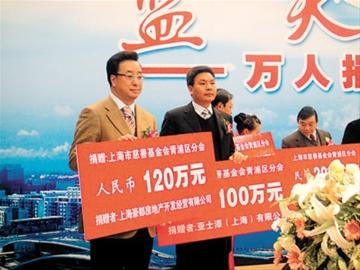 據(jù)介紹,青浦此次舉行的“慈善一日捐”活動(dòng)募得的善款,是該區(qū)歷年募捐總額的2.8倍,創(chuàng)歷史新高。在參與捐贈(zèng)的700余家單位中,景港控股集團(tuán)捐贈(zèng)1000萬(wàn)元;青浦工業(yè)園區(qū)、上海徐涇建筑工程有限公司、上海豪都房地產(chǎn)開(kāi)發(fā)經(jīng)營(yíng)有限公司等18家單位捐贈(zèng)了100萬(wàn)元以上。(談燕)