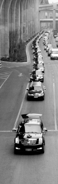 中午12點(diǎn),這個(gè)婚車隊(duì)又出現(xiàn)在了穿金路上。一輛凱迪拉克越野車排在車隊(duì)最前方,負(fù)責(zé)開道和攝像。新郎、新娘乘坐的加長林肯緊隨其后,7輛奔馳S350和1輛奔馳320行駛在車隊(duì)靠前方陣,7輛寶馬X5和3輛凱迪拉克位于車隊(duì)中間,3輛保時(shí)捷卡宴押后。這些車輛除兩輛為重慶牌照、一輛為廣州牌照外,其余車輛均掛著昆明本地車輛號(hào)牌。車內(nèi)的人不時(shí)搖下車窗,幾乎所有車輛上的司機(jī)和乘客都是年輕人,其中不乏剃著光頭的時(shí)尚潮人。