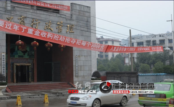 帖中照片顯示,在一幢懸掛“工商行政管理”六個(gè)金色大字招牌的辦公大樓正門(mén)前,掛著兩條白字紅底的標(biāo)語(yǔ)橫幅,其中一條紅色條幅上印制的內(nèi)容是“要過(guò)年了重金收購(gòu)收購(gòu)搶劫搶奪犯每個(gè)3000元”,第二條幅的內(nèi)容是“入室盜竊犯每個(gè)2000元(僅限本地捕獲)貨到××”,兩條幅下的右下角印有一行小字,即標(biāo)語(yǔ)的宣傳單位是“南莊坪辦事處”的字樣,很是吸引人的眼球。