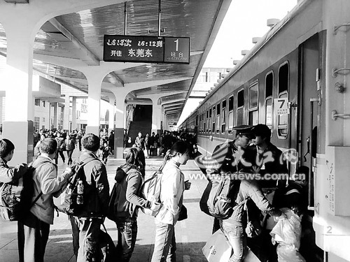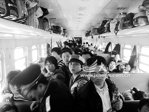 21日,記者登上了從南昌開往東莞東的L613次列車。據(jù)列車長(zhǎng)萬軍介紹,L613次是往返于南昌和東莞并套跑深圳的臨時(shí)客車,由19節(jié)車廂組成,除去餐車、行李車、宿營(yíng)車,其余全是硬座車廂,途經(jīng)我省新干、吉安、泰和、興國(guó)、贛州5個(gè)站次,全程歷時(shí)18小時(shí)。和車次一樣,50多位乘務(wù)人員也都是“臨時(shí)”的,他們分兩班,隔9個(gè)小時(shí)倒班一次。