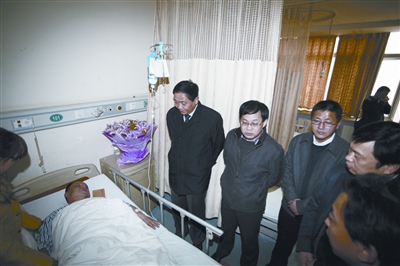 大年初二,在連續(xù)工作近一個(gè)月后,37歲的江漢區(qū)城管執(zhí)法大隊(duì)直屬六中隊(duì)隊(duì)員劉漢橋突發(fā)腦溢血。昨日(21日)下午,江漢區(qū)委書記張平、區(qū)長(zhǎng)李強(qiáng)來到協(xié)和醫(yī)院,看望了劉漢橋及妻子,并送去鮮花、慰問金和營(yíng)養(yǎng)品。