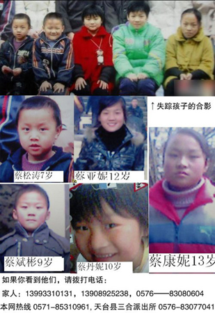 2月18日,天臺(tái)縣三合鎮(zhèn)下路王村的蔡修明、蔡修通兄弟家的5名兒童突然失蹤。據(jù)了解,蔡家兄弟常年在甘肅做生意。過年期間,蔡家兄弟帶兒女們回老家過年。2月18日14時(shí)許,蔡修通13歲的女兒蔡亞妮帶著3個(gè)親姐弟及蔡修明的小兒子蔡松濤,去1公里外的同誼村找同學(xué)玩。一小時(shí)后,蔡亞妮的母親發(fā)現(xiàn)找不到女兒了。隨即,蔡家人發(fā)動(dòng)全村親友尋找。但村民兩百余人遍尋周邊村莊、山上、湖泊都未找到。