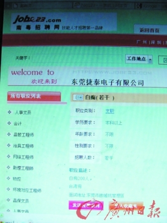 記者在網(wǎng)上搜索,果然看到了報(bào)料人所說(shuō)的招聘信息,分別發(fā)布在南粵招聘網(wǎng)和東莞智通人才網(wǎng)和“我搜網(wǎng)”上。招聘信息注明了職位類別是文職,招聘期限為2010年2月26日至5月26日。在學(xué)歷要求方面,“白癡”要求本科以上,“人妖”要求初中以上,年齡和性別要求則不限,工作地點(diǎn)在東莞。