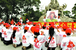 宣誓完畢,活動進(jìn)入高潮,“老板們”后退一步,轉(zhuǎn)過身來面對著雷鋒畫像,齊齊雙膝跪地,以表示“對雷鋒精神的虔誠和最高敬意”,然后起立對畫像三鞠躬。隨后,這些人又向路人散發(fā)活動的紅色文化帽和文化衫,以號召更多人“向雷鋒同志學(xué)習(xí)”,把雷鋒精神轉(zhuǎn)化為自己的“心靈財富”。