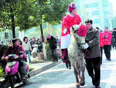 昨日,一場別致的復古婚禮在芙蓉區(qū)嘉雨路上演,新郎沒有像其他年輕人用豪華車隊迎娶新娘,而是騎著白馬,讓人抬著大紅花轎把新娘子娶回家。