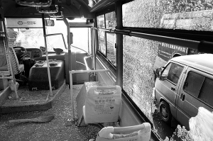 昨日17時(shí),記者趕到現(xiàn)場(chǎng)。為了不使被砸的這輛25路公交車影響其它公交車發(fā)車,該車已經(jīng)從站點(diǎn)移開(kāi)。被砸公交車的前風(fēng)擋玻璃、前車門玻璃以及車兩側(cè)近10塊車玻璃被砸碎,車內(nèi)滿地是玻璃碎片。