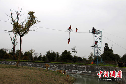 “小燕子”迅速調(diào)整姿勢(shì)、繼續(xù)前進(jìn),剛剛十步開(kāi)外,最驚險(xiǎn)的一幕出現(xiàn)了,園中的老虎似受到現(xiàn)場(chǎng)緊張氣氛的影響,突然顯得有些躁動(dòng)不安,在鋼絲繩下來(lái)回走動(dòng),并警覺(jué)的看著上方的挑戰(zhàn)者“小燕子”,驚天動(dòng)地般地呼嘯了兩聲后,成年公虎“阿彪”向著“小燕子”所在的上方跳去,差點(diǎn)碰到位于鋼絲下方領(lǐng)路的自行車扶梯上。同時(shí),一只母虎試圖爬到附近的大樹(shù)上。“小燕子”一度陷入了老虎觸爪可及的危險(xiǎn)境地,實(shí)在是讓現(xiàn)場(chǎng)觀眾為她捏了一把冷汗。鋼絲上,命懸一線的“小燕子”,在空中搖晃了幾下,停下來(lái)凝神吸氣,盡力控制住鋼絲不再晃動(dòng),一步一步向鋼絲另一端走去。終于,“小燕子”耗時(shí)近20分鐘,成功的完成挑戰(zhàn),一舉突破50米,創(chuàng)造了自己新的紀(jì)錄,爾后空手走到自行車前“凱旋”,觀眾忍不住拍手叫絕。