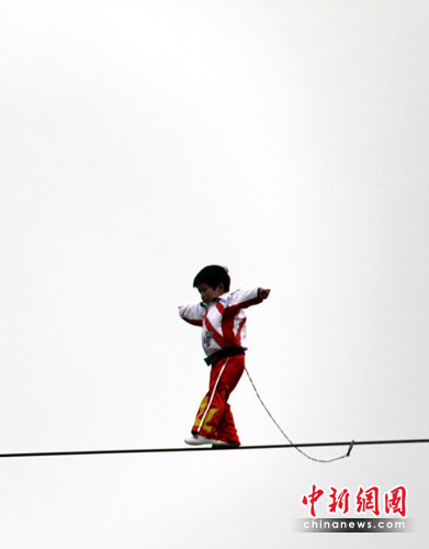 中新網(wǎng)常州3月30日電(記者 唐娟)30日,年僅3歲半的江西女童“小燕子”(藝名,原名張小燕),在江蘇常州淹城野生動(dòng)物世界上演了一出老虎頭上空手走鋼絲的驚險(xiǎn)絕技。在成功走了50米鋼絲后,“小燕子”所在的江西神童藝術(shù)團(tuán)張團(tuán)長(zhǎng)宣布,三日后,“小燕子”將向百米發(fā)起挑戰(zhàn),刷新紀(jì)錄,并申報(bào)“虎口空手走鋼絲”吉尼斯世界紀(jì)錄;同時(shí),“小燕子”將在常州淹城野生動(dòng)物世界設(shè)下一個(gè)月的擂臺(tái),歡迎國(guó)內(nèi)外各界人士前來(lái)挑戰(zhàn),勝者當(dāng)場(chǎng)懸賞100萬(wàn)元。