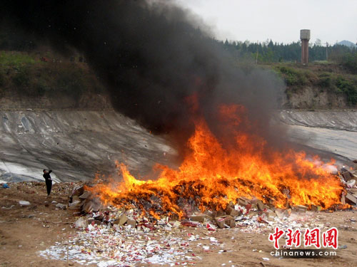 中新網(wǎng)綿陽3月30日電 (楊超)30日,伴隨著烈火濃煙,38600條假煙灰飛煙滅。這是2008年4月以來,四川綿陽市煙草專賣部門舉行的首次集中銷毀假煙行動。