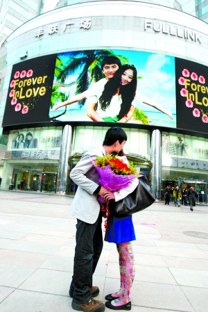 婷婷的男友田新營(yíng)告訴記者,他比婷婷年長(zhǎng)兩歲,來自山東,和婷婷是通過朋友介紹認(rèn)識(shí)的。當(dāng)時(shí)他剛剛辭了工作,正處于事業(yè)的低谷,可是婷婷并沒嫌棄,反而給了他無限的勇氣,后來他找到了新工作。田新營(yíng)說,半年前他就一直在想以什么方式向婷婷求婚,有一天他從這塊大屏幕下路過,突然來了靈感。1個(gè)月前,他向商場(chǎng)請(qǐng)求,想通過大屏幕向女友求婚。商場(chǎng)覺得這是件好事兒,很爽快地答應(yīng)了。于是就有了這段浪漫、溫馨的求婚現(xiàn)場(chǎng)。(于海波)
