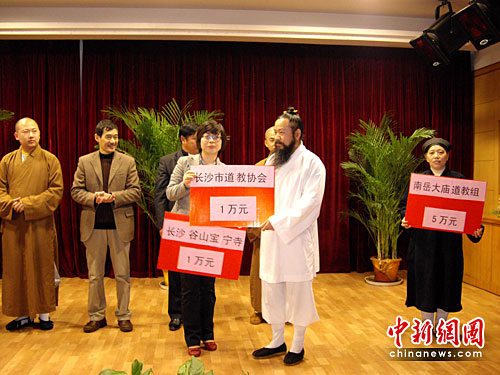 捐款儀式上,湖南省省長助理袁建堯帶頭捐出2000元,隨后湖南省佛教協(xié)會、湖南省伊斯蘭教協(xié)會、湖南省天主教愛國運(yùn)動委員會和天主教教務(wù)委員會、湖南省基督教“三自”愛國運(yùn)動委員會和基督教協(xié)會、長沙市道教協(xié)會、長沙麓山寺、南岳大廟道教組和長沙谷山寶寧寺等單位的代表紛紛走上臺捐款,表達(dá)宗教界人士和信教群眾的愛國之情、慈善之心。