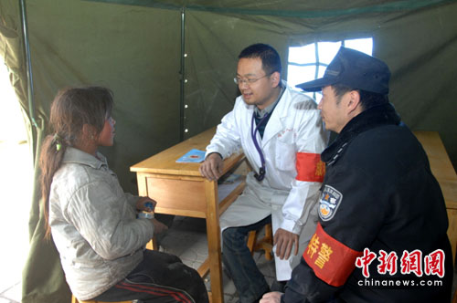 看到特警隊(duì)員們搭好了帳篷、送來(lái)了水果,第二完全小學(xué)的學(xué)生們眼含淚水,激動(dòng)地拍手感謝:“謝謝成都來(lái)的警察叔叔!”可愛的藏族小女孩文茂拿著粉筆在帳篷里的黑板上重重地寫下“感謝警察叔叔、感謝祖國(guó)、感謝你們每個(gè)人”。正在這里學(xué)習(xí)唱歌的十七、八個(gè)3、4年級(jí)的小學(xué)生也不約而同地為特警隊(duì)員表演了他們這兩天才學(xué)會(huì)的歌舞——“感恩的心,感謝著你……”同時(shí),成都特警支隊(duì)的隨隊(duì)醫(yī)生又和成都市第三人民醫(yī)院的醫(yī)生劉雁軍一起,開了“小診所”,為這里患病的學(xué)生進(jìn)行診治,還送上了藥品和飲用水。(完)