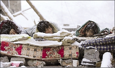 昨天8時(shí),結(jié)古鎮(zhèn)的車輛和帳篷上已積起一寸厚的雪,到處一片白茫茫。部隊(duì)官兵和受災(zāi)群眾正在清掃積雪,路上行人稀少。昨天的平均氣溫就7至8攝氏度。玉樹州氣象局副局長澤仁扎西說,降雪從22日5時(shí)05分開始,主要集中在結(jié)古鎮(zhèn)。至8時(shí),結(jié)古鎮(zhèn)雪已深達(dá)30毫米。22日最低氣溫為零下1.6攝氏度。23日至24日,結(jié)古鎮(zhèn)還將有一場(chǎng)至少同等規(guī)模的降雪,平均氣溫降4至6攝氏度。