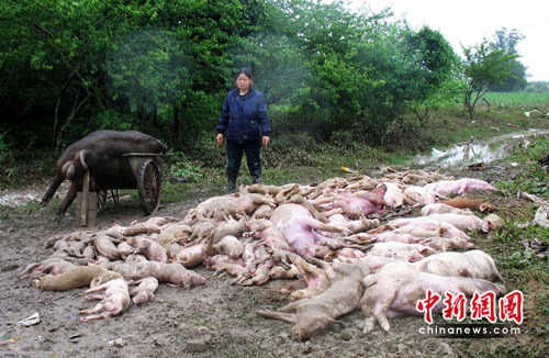 翁源縣官渡養(yǎng)豬場老板林德富告訴記者,6日晚11時左右,暴雨使得水勢迅速在整個養(yǎng)豬場蔓延,造成損失至少1200多頭豬。面對被洪水沖得一片狼藉的養(yǎng)豬場,這個56歲的漢子忍不住蹲在地上掩面而泣。