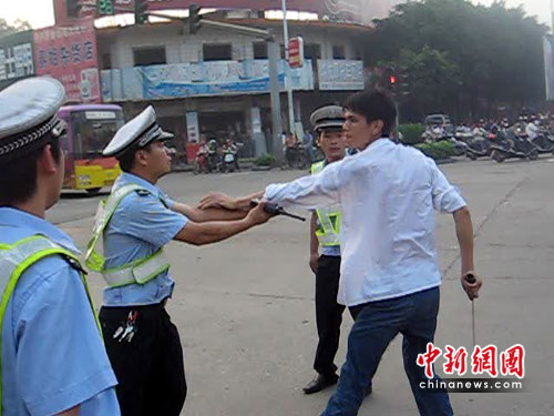 該司機(jī)在返回現(xiàn)場接受處理時直接質(zhì)問民警:“現(xiàn)在已經(jīng)是傍晚6點30分了,我的車為什么還不能過?”情緒異常激動的他跟本聽不進(jìn)執(zhí)勤民警的任何解釋和勸導(dǎo)。隨后,該司機(jī)回到貨車駕駛室內(nèi)拿來一把長約一米的大砍刀,徑直來到中山崗紅綠燈路口就想沖上前欲砍民警。