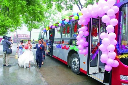 5月16日清晨,一輛被裝扮一新的“公交婚車”從石家莊市駛往井陘。有過往市民在看到這輛引人注目的“婚車”后,忍不住發(fā)出感慨:“這比凱迪拉克當(dāng)婚車還拉風(fēng)啊!倍俗谶@輛公交婚車上的新郎趙欽,則一路幸福地盼望著迎接新娘。據(jù)介紹,此次婚禮的一對新人都是公交司機(jī),以公交車當(dāng)婚車既是因?yàn)閷卉囉刑厥飧星,也是希望倡?dǎo)低碳生活。