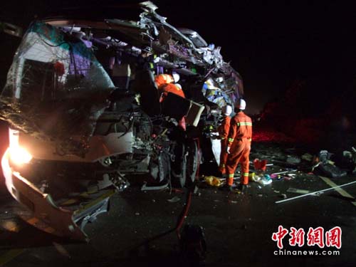 消防官兵現(xiàn)場(chǎng)了解到,事故發(fā)生后兩車上的傷員已在先期到場(chǎng)的民警及現(xiàn)場(chǎng)熱心群眾的幫助下送往醫(yī)院救治,但仍有10人被困于兩車之上,估計(jì)全部遇難。為盡可能救助受困人員,消防官兵馬上組織了救援行動(dòng),四名官兵爬上變形車體,利用液壓擴(kuò)張器和切割機(jī)切開擠壓在被困者身上的零部件,而后將人員一一抬出?墒且蜍圀w變形扭曲嚴(yán)重,多名遇難人員均是被座位和車輛部件緊緊絞壓,使得救援行動(dòng)困難重重。