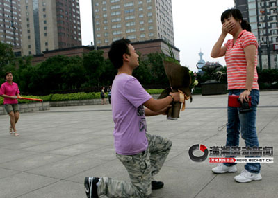 “胡安萱,我好愛好愛你!”70米長(zhǎng)的大紅橫幅從象征“幸!钡哪μ燧喩洗瓜,長(zhǎng)沙小伙王樂手捧玫瑰單膝下跪向女友求婚:“老婆,嫁給我吧,我們生個(gè)兒子讓他早點(diǎn)過(guò)兒童節(jié)!”