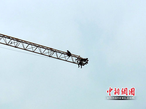 中新網(wǎng)柳州6月3日電(羅海生 黃坤軍)6月3日,廣西柳州市東環(huán)路一在建工地35米高的塔吊頂端,三名農(nóng)民工為了討薪欲跳塔。接警后柳州特勤消防大隊迅速出動一臺多功能救援車、1臺53米云梯車,9名官兵趕赴現(xiàn)場救援,經(jīng)過近一個小時的勸說三民男子才放棄了輕生的念頭。