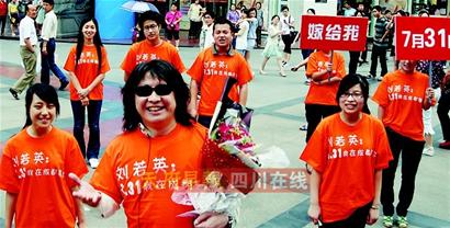 下午3時,春熙路口出現(xiàn)一群身著橘色T恤衫的年輕人,T恤上印有“支持奶茶哥,7·31我在成都等你”等字樣。他們迅速排成一個“心”形隊列,手舉紅色的口號牌大喊:“劉若英,嫁給‘奶茶哥’吧!”“眼尖”的市民立馬就認(rèn)出了站在隊伍最前面的“莫扎特趙”,就是現(xiàn)在廣為成都市民所熟知的“奶茶哥”!澳滩韪纭贝髦R,身穿橘色T恤、白色休閑褲,手上捧著一大束玫瑰花,看起來心情不錯。
