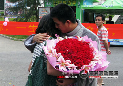 扮成灰太狼的吳先生引來(lái)了不少剛放學(xué)的小朋友圍觀,不少正在公園游玩的市民也圍過(guò)來(lái)湊熱鬧。10分鐘之后,吳先生的女朋友來(lái)到了現(xiàn)場(chǎng),他將一大束玫瑰獻(xiàn)給女主角,單膝跪下,大聲說(shuō),“嫁給我吧!”這時(shí)樂(lè)隊(duì)響起,圍觀的人都叫起來(lái):“嫁給他!嫁給他!!”